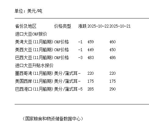 10月22日進口大豆到國內(nèi)港口C&F及升貼水報價